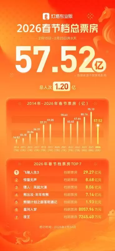 2026年春节档落下帷幕。据国家电影局统计,2026年春节档(2月15日至2月23日)总票房达57.52亿,总人次1.2亿。《飞驰人生3》《惊蛰无声》《镖人:风起大漠》分列档期票房前三名。