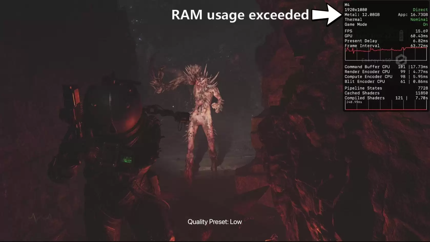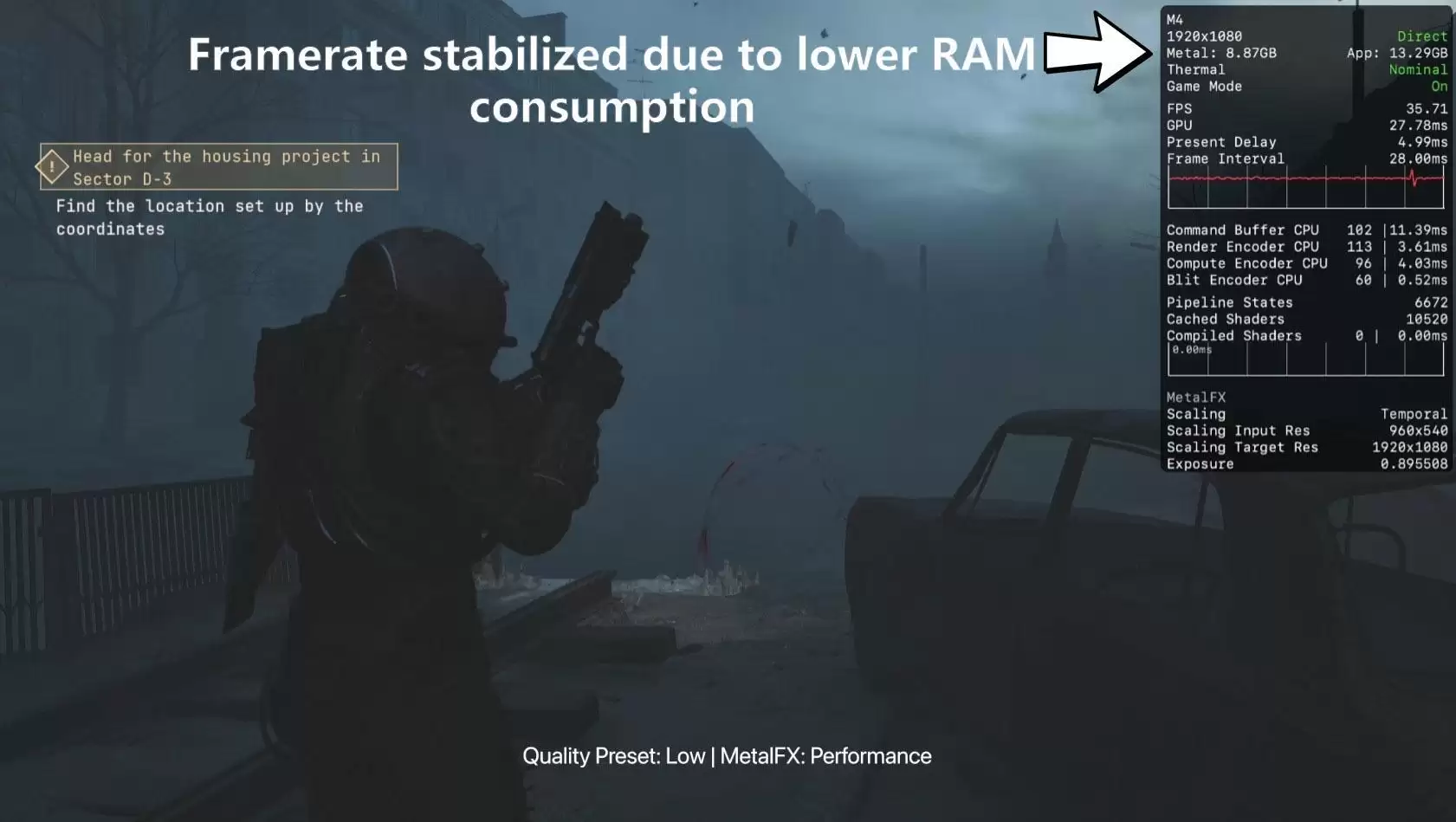 为此,YouTube博主MrMacRight昨天特意测试了16GB内存Mac在游戏中的性能表现。测试观察到,即便使用低画质并开启MetalFX,也无法确保搭载M4芯片的Mac能提供流畅的游戏体验。