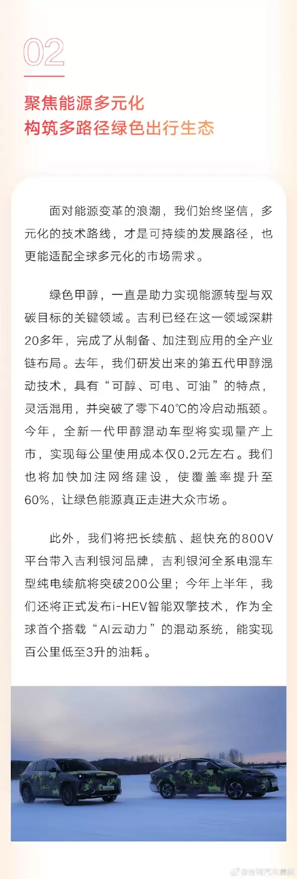 在新能源技术领域,吉利持续深耕绿色甲醇产业二十余载,构建起覆盖制备、储运、加注、应用的完整产业链。去年推出的第五代甲醇混动技术实现了重大突破,搭载该技术的车辆可在零下40摄氏度的极端环境下正常启动,并具备甲醇、电力、燃油三种能源模式的灵活切换能力。这项创新技术已应用于全新一代甲醇混动车型,该车型将于今年量产上市,其每公里使用成本可控制在0.2元的优异水平。
