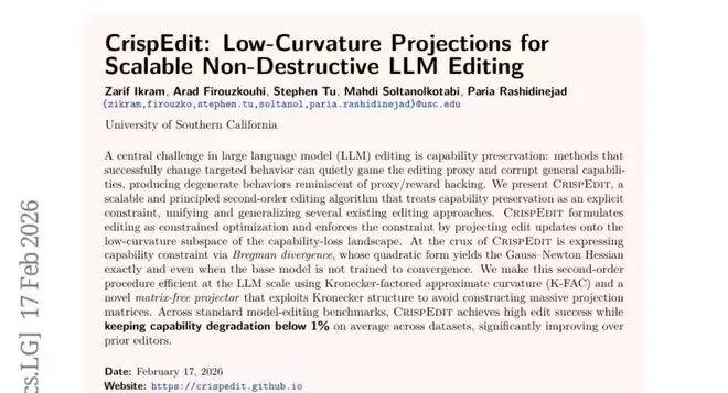 这项由南加州大学计算机科学系团队完成的研究发表于2026年2月,论文编号为arXiv:2602.15823v1,为大语言模型的知识更新问题提供了全新解决方案。研究团队开发的CrispEdit方法,就像给AI装上了一个精准的"知识手术刀",既能植入新知识,又不会损坏原有能力。