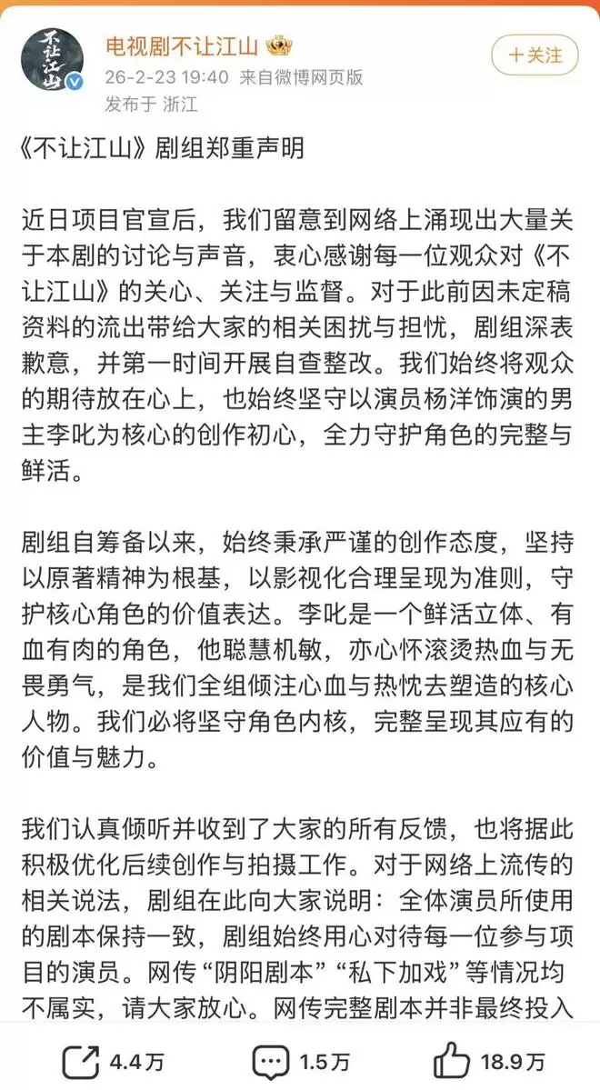 近日,《不让江山》剧组发布公开声明,否认网传“阴阳剧本”“私下加戏”等网络传闻,非但未能平息争议,反而引发舆论汹涌反弹,甚至触发杨洋粉丝联合抵制。