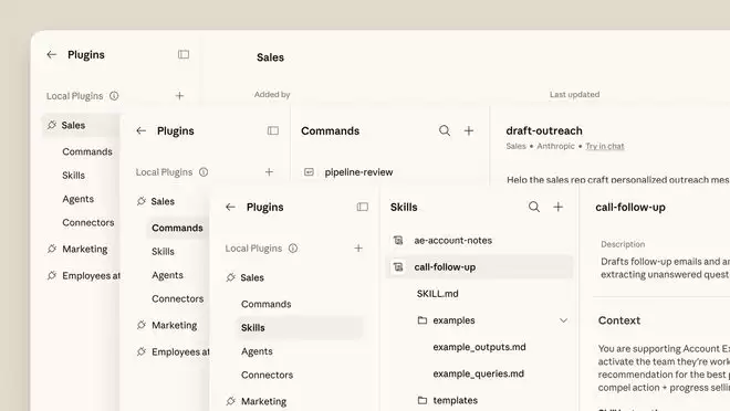 Anthropic致力于将自身定位为企业工作流程中的默认操作层。此次发布的核心是可定制的"插件",这些专业AI助手可针对财务分析、设计、运营和人力资源等不同岗位进行配置。