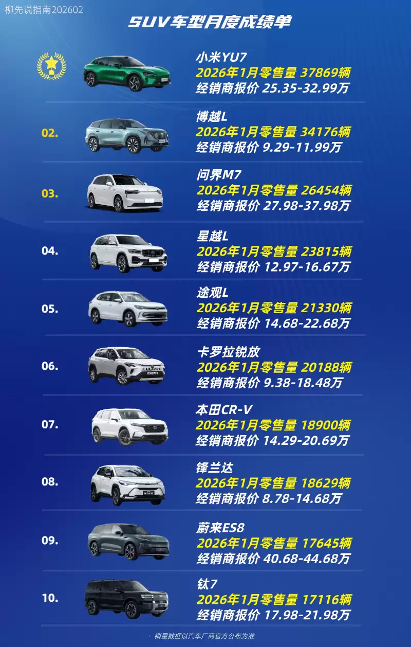 2026年1月SUV销量洞察:小米YU7登顶背后的市场变革趋势