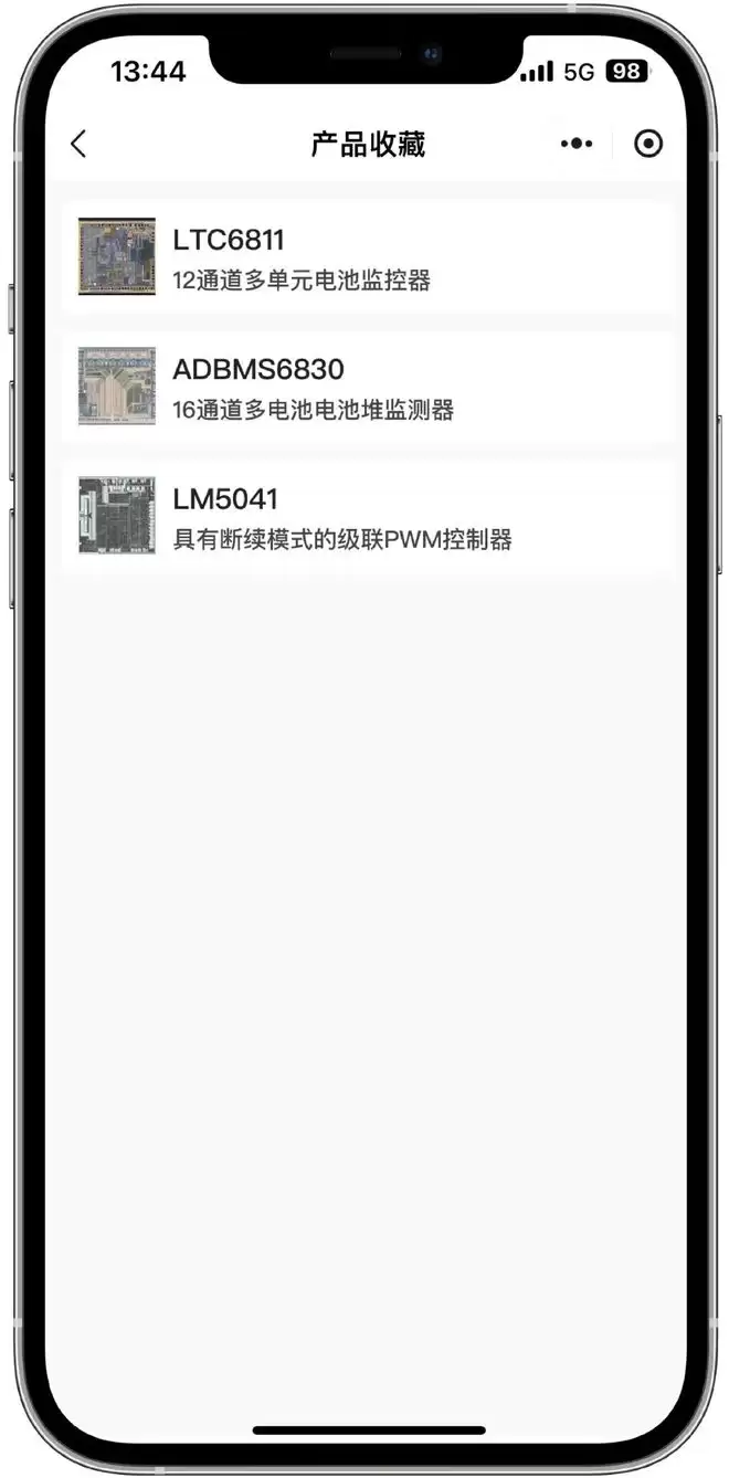 首页作为信息聚合的核心入口,最大化降低了用户的操作成本。您可以通过顶部的搜索栏,直接输入关键词查找感兴趣的专业分析报告,快速定位结果。以ADBMS6830为例,进入小程序后,通过搜索栏搜索ADBMS6830,可以进入ADBMS6830的详情页,查看顶层概览图、模块布局图、器件截图、典型层次化电路、重点模块高清图等信息。