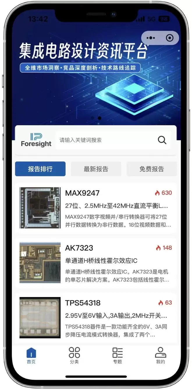 在“产品分类”中,您可以按芯片类型(如电源管理、射频、传感器等)快速筛选相关报告;“厂商分类”汇集了行业头部厂商产品的资讯报告;“应用分类”则覆盖消费电子、汽车电子、工业控制、人工智能等核心场景,助力您聚焦特定领域的技术动态。