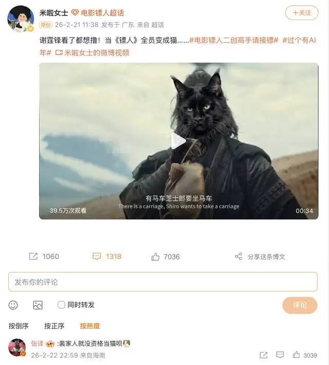 动漫、科技、读书这些领域的博主也陆续加入 # 电影镖人二创高手请接镖 # 超话活动, CP 混剪、同人图、 AI 视频、剪纸,活动发起 5 天,阅读量就超过 3200 万,讨论量超 5 万,参与人数 1.8 万,直接带动影片超话登顶电影超话榜。