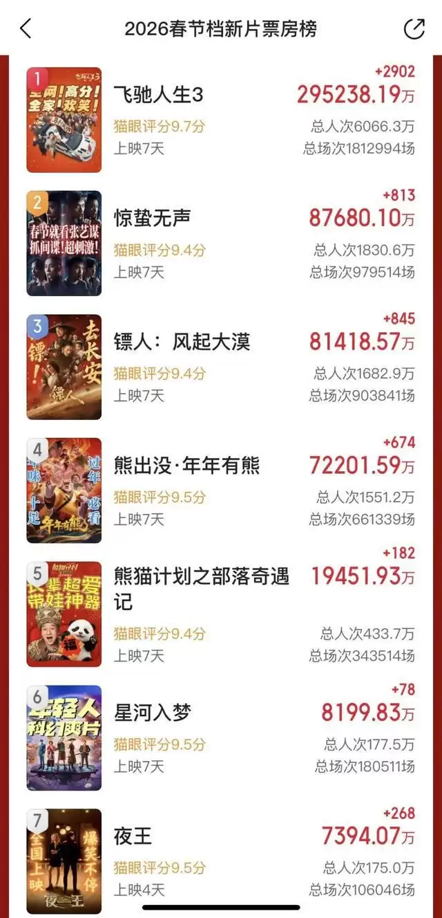 “ 史上最长春节档 ” ( 9 天)即将落下帷幕,截至发稿前, 2026 春节档总票房已超过 57 亿。《飞驰人生 3 》夺得档期冠军,占据大盘半壁江山,《惊蛰无声》与《镖人》分列二三名,票房你追我赶。虽然没出现去年春节《哪吒之魔童闹海》那样的超级爆款,但整体表现稳扎稳打,算是平稳落地。