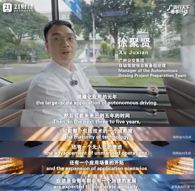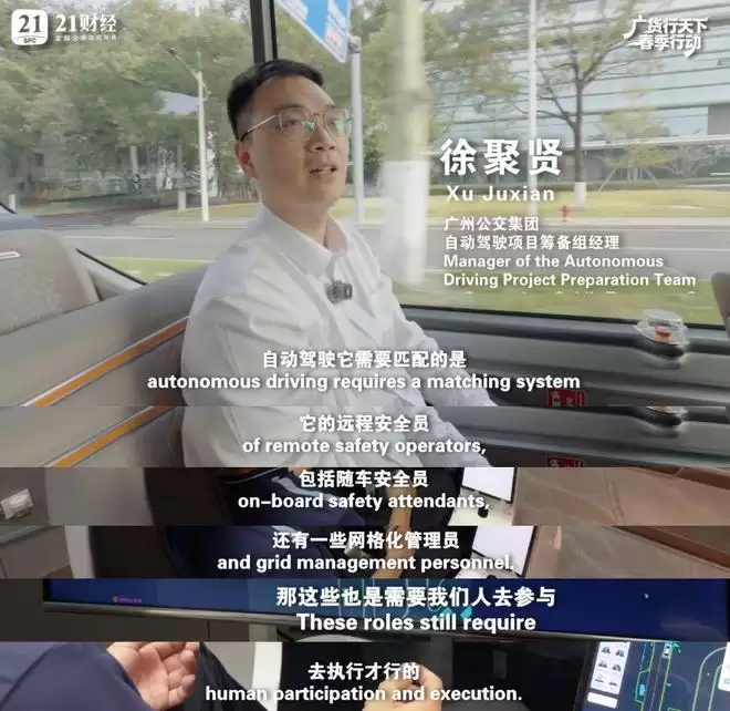 徐聚贤:“自动驾驶它需要匹配的是远程安全员,包括随车安全员,还有一些网格化管理员,这些也是需要我们人去参与去执行的。随着规模增加,我们会逐步去安排一些公交车驾驶员去转型培训成为我们的安全员,通过这种方式使得我们的职工去转变工作岗位,去应用AI去更好地服务整个线路的运营。”