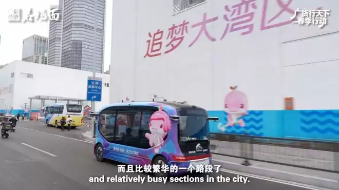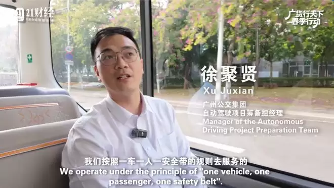 广州公交集团自动驾驶项目筹备组经理 徐聚贤:“这是我们公交集团6米 L4级别自动驾驶巴士,我们按照一车一人一安全带的规则去服务的,您如果没戴安全带的话,这个屏幕会显示提醒系上安全带。”