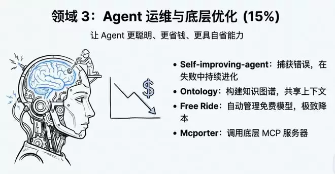 比如 降本增效(Token 优化器、Smart Model Switching、Free Ride)、自主性与记忆(Self-improving-agent、Memory Manager)、身份与角色(AI Persona OS)。这些 Skill 试图为 Agent 建立认知闭环,让它能自我纠错、持续进化。