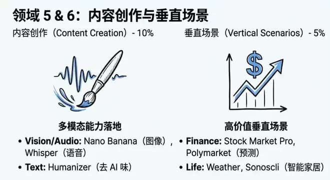用 API 打通信息流(35%),用研究解析工具获取高质量输入(20%),用开发者设施落地代码(15%),用运维优化工具持续进化(15%),用多媒体工具生产内容(10%),最后用垂直场景 Skill 服务具体需求(5%)。