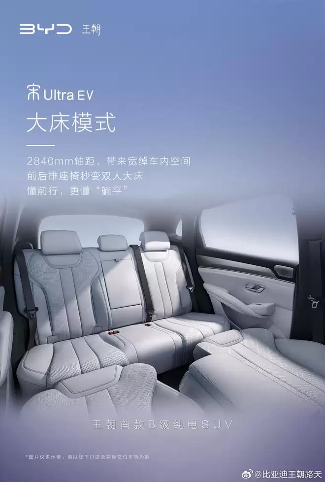 新车中央扶手区配备双手机无线充电板(预计支持50W无线快充)、杯架等实用配置,并保留物理按键与旋钮操控。宋Ultra EV轴距达2840mm,支持前排座椅放倒,可实现“前后排秒变双人大床”的灵活空间布局。