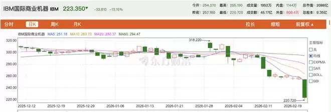 周一美股收盘时,IBM(IBM.US)大跌13.15%,收于每股223.35美元,创下自2000年以来的最大单日跌幅。