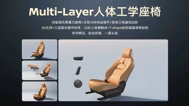 新座椅还采用了专为防眩晕设计的 T-Shape 结构,通过降低座椅重心,在车辆转弯或经过颠簸路面时提供更好的支撑来分担压力,有效缓解乘车眩晕感。
