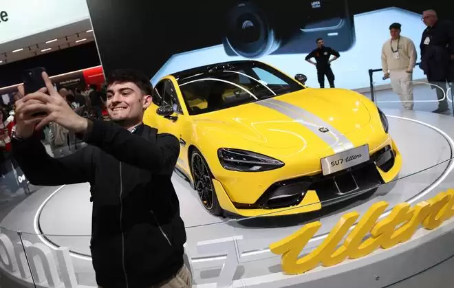 2025年3月6日,在西班牙巴塞罗那举行的2025年世界移动通信大会上,一名男子和小米汽车合影。