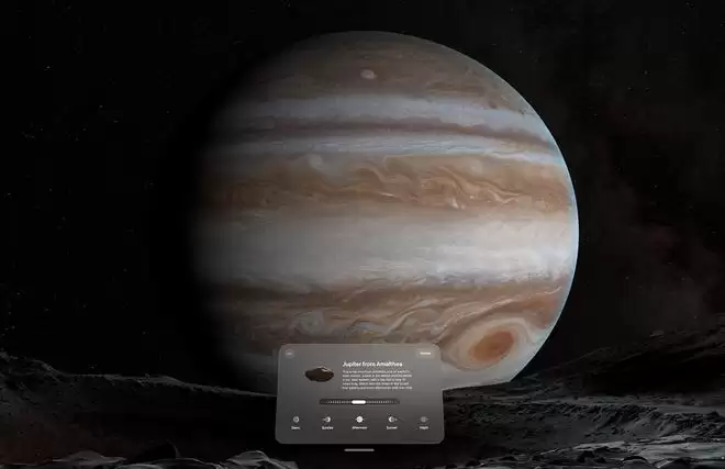 而面对缺乏实地数据的外太空场景,设计团队转向了严谨的科学推演。IT之家援引博文介绍,苹果团队在开发全新的"木星"环境时,精心挑选了直径约144公里的木卫五作为落脚点,以确保木星在视野中既能带来巨物震撼,又不会产生压迫感。