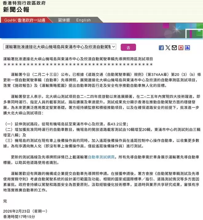 香港特区政府新闻公报公布本次自动车辆先导牌照跨区测试项目
