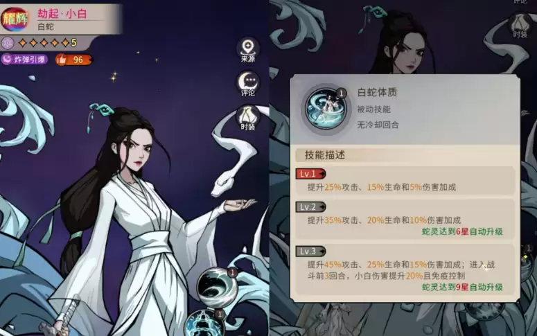 被动技能“白蛇体质”,有个很实用的免控效果。9星以后,前3回合可以免疫控制,这点在pvp和高难度副本里帮助很大。很多队伍都是靠前期控制建立优势,白蛇有了这个免控就能稳稳站住前期,不会被对面直接控死。虽然只有前3回合,但通常前3回合才是最重要的时候。