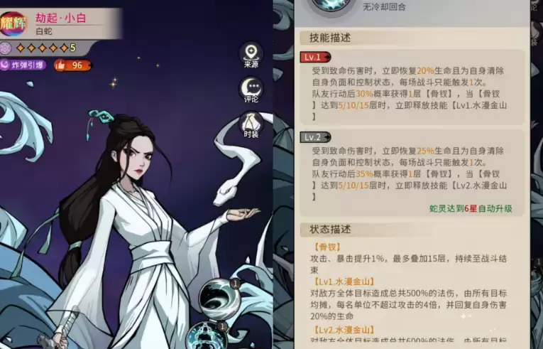 第二个被动“渡劫之志”,才是白蛇真正的核心优势。首先能保命,受到致命伤害不会直接死,还能回血清除负面状态。这点大大提升了生存能力和反打空间,就算被集火也有翻盘机会。其次就是输出机制了,队友每次行动后,有40%几率,给白蛇叠一层骨锥。叠到5层、10层、15层的时候,就能释放“水漫金山”打全体aoe伤害。15层的伤害倍率,有700%法伤,配合队友高频率行动,能快速叠层释放多次aoe。
