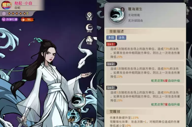 白蛇的主动技能叫“覆海潮生”,可以对敌方随机造成5次攻击。每段攻击基础伤害是99%,5段加起来就是495%伤害。虽然命中同一个目标伤害会降低15%,但这种多段攻击机制在实战中其实挺灵活的。而且主动技能7星就能点满,相比其他耀辉角色要14星才满级,白蛇在养成成本上确实友好很多,前期就能把技能拉满。