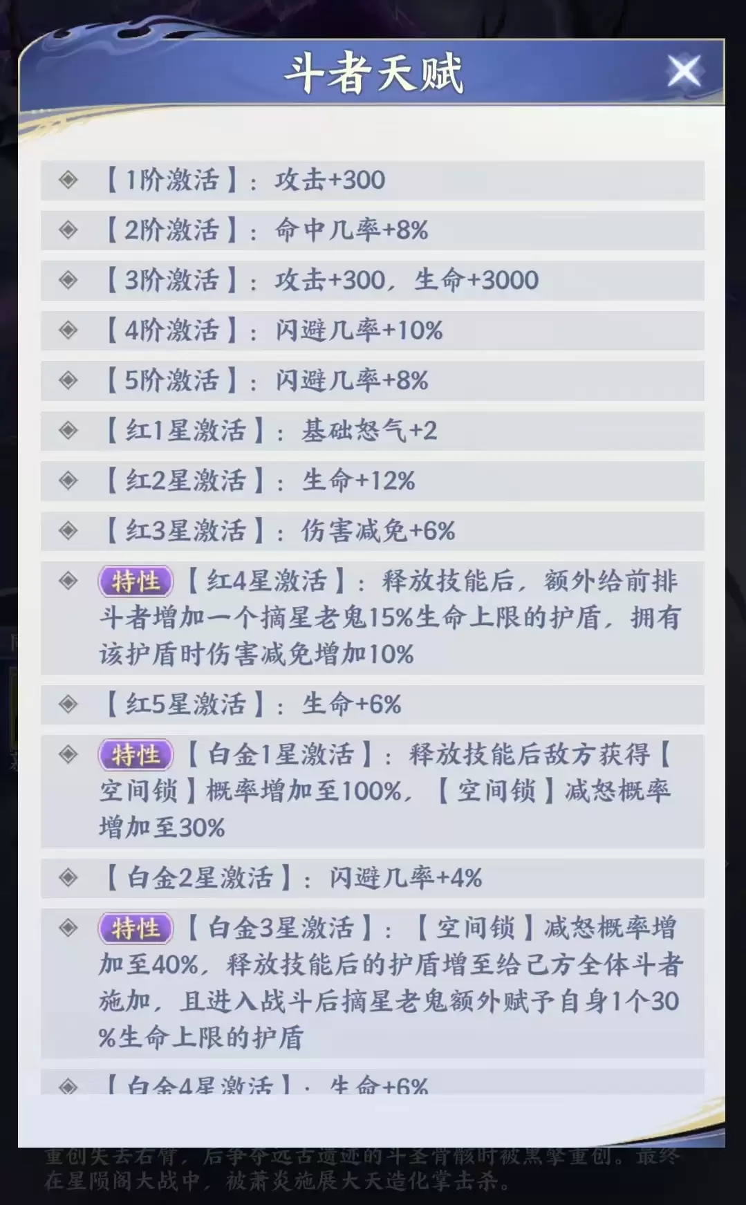 角色的成长路径清晰且效果显著:升至红四星后,释放技能可为前排斗者附加护盾,提供稳定的伤害减免;进阶至白金一星时,“空间锁”的命中率提升至100%,减怒触发概率同步增强;达到白金三星后,护盾覆盖范围扩展至己方全体,并在战斗开始时自动赋予摘星老鬼自身一层初始护盾;当突破至彩一星,若其施加的护盾被敌方击破,则有概率使对应目标陷入眩晕状态。由此可见,摘星老鬼并非起步即强的速成型角色,而是典型的高成长性限制系斗者,越是后期越能发挥其体系压制力。