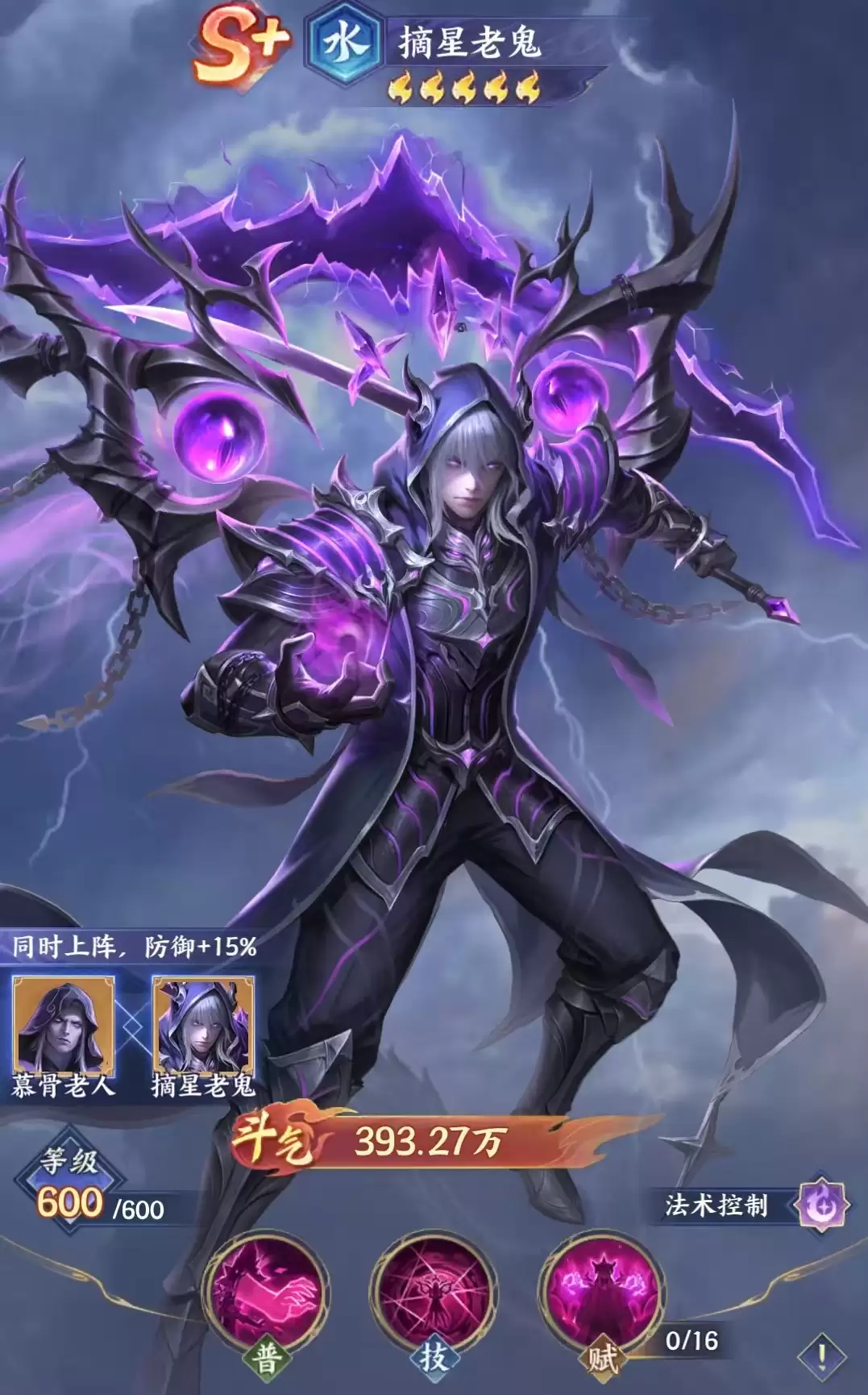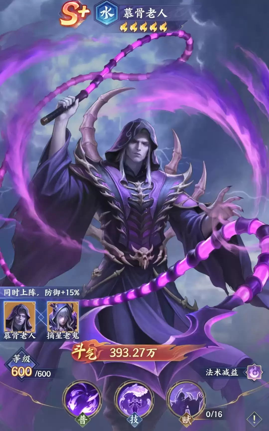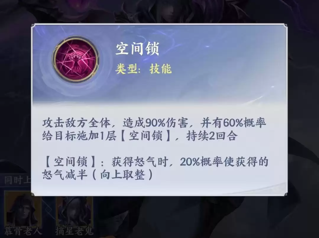 摘星老鬼拥有专属的“水”属性,评级为当前版本最高档的S+。他与慕骨老人存在战斗羁绊:当两人同时上阵时,全队可获得额外的15%防御加成。其核心技能“空间锁”为全体范围伤害技能,命中后必定为目标施加一层持续两回合的“空间锁”状态。该状态触发时,敌方每次获取怒气均有概率减半——此乃关键的控制怒气机制,能直接削弱对手释放大招的频率。
