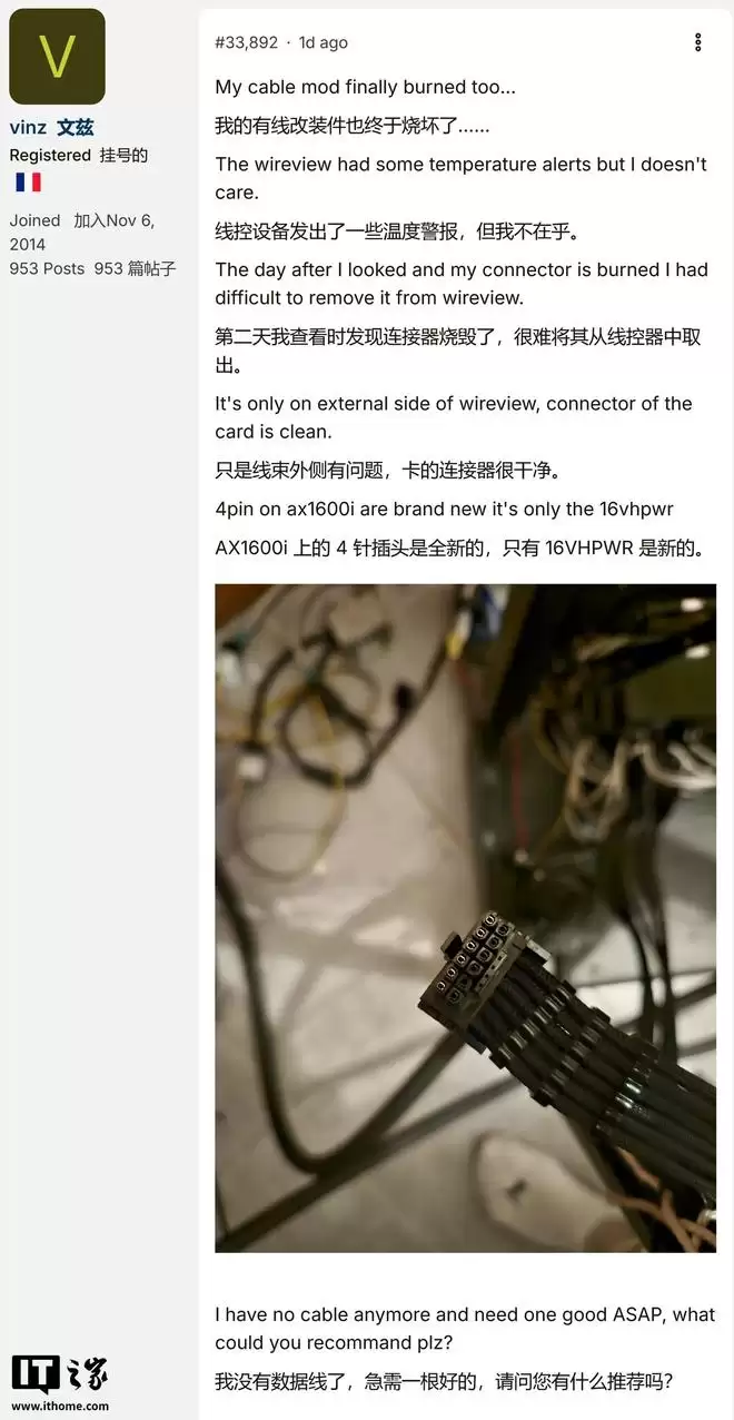 根据玩家展示的现场图片,Wireview PRO的外部接口及其连接的16VHPWR定制线缆均发生了严重的熔毁损坏。烧毁的线缆与设备接口部分甚至已经粘连在一起,导致玩家很难将损毁的线缆从Wireview设备上拔下。