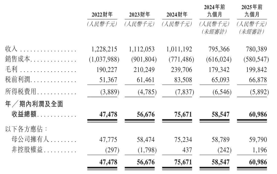 招股书披露,宏业基在2022年、2023年及2024年的营业收入分别为12.28亿元、11.12亿元和10.11亿元;毛利分别为1.9亿元、2.1亿元和2.4亿元;期内利润则依次为4748万元、5668万元和7567万元。