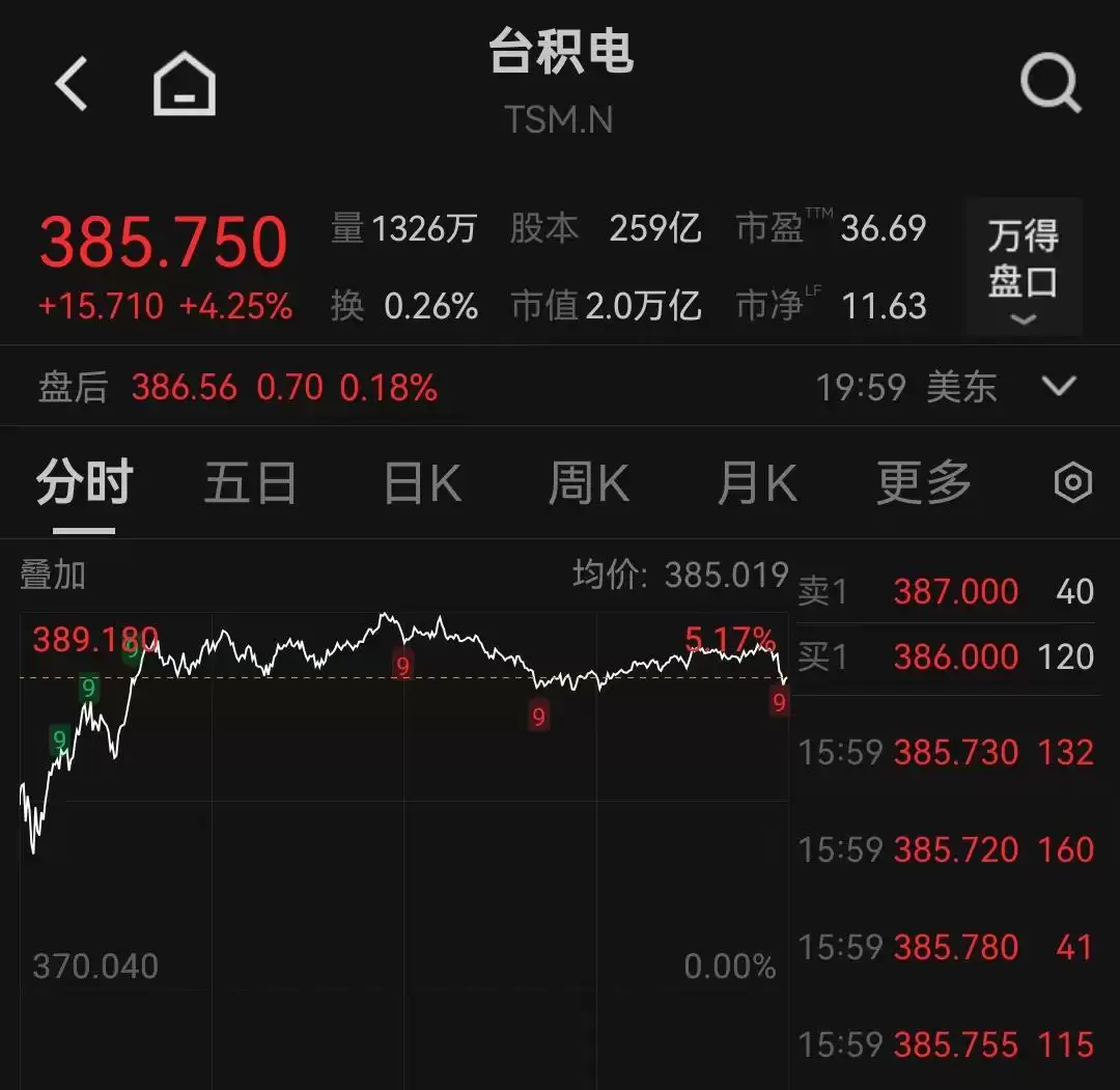 当日,台积电股价大涨4.25%,收于385.75美元每股,公司收盘市值正式突破2万亿美元大关。距离它上次超越这一整数关口,仅仅过去了约16个月。回顾2024年10月,台积电发布当年第三季度财报后,市值首次站上1万亿美元,成为史上第七家市值破万亿的科技公司。短短一年多时间,其市值便实现了翻倍增长。