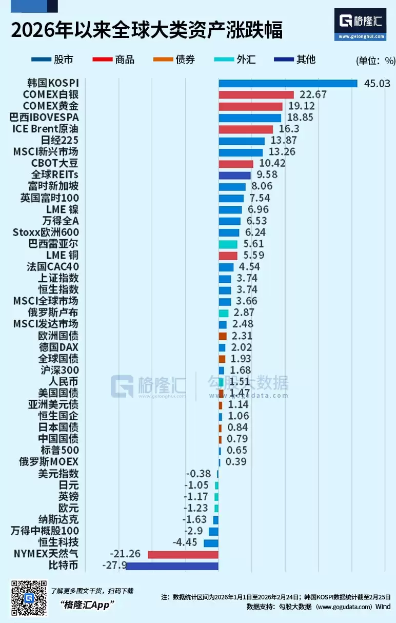 韩国综合指数今年1月22日刚刚站上5000点,仅用一个多月时间就累计攀升逾1000点。继2025年以75.63%涨幅领跑全球主要股市后,韩国综合指数2026年至今再度累计上涨45%,持续保持全球领先地位。