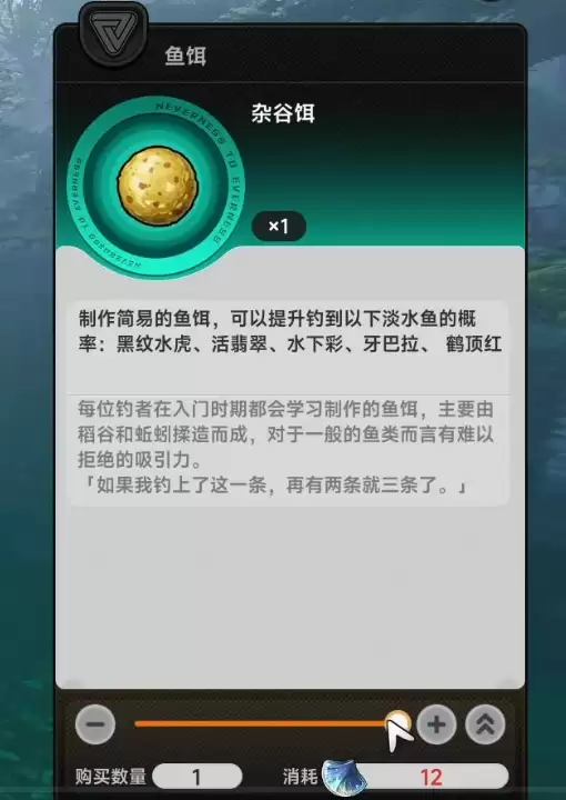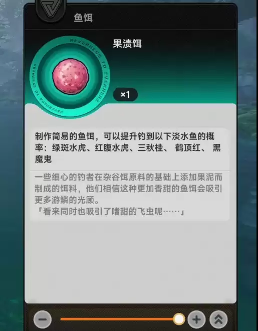 然后是杂谷饵这个东西。这种鱼饵的制作材料,主要是稻谷加上蚯蚓混在一起揉成的,配方听起来挺朴素的。用它来钓鱼的话,会明显提高钓到黑纹水虎、活翡翠、水下彩、牙巴拉,还有鹤顶红这几种淡水鱼的概率。基本上每个刚学钓鱼的玩家,都会先接触到这种饵料,因为它制作起来比较简单,材料也容易弄到手。如果你现在就是想专门针对这几种淡水鱼类去钓的话,那杂谷饵肯定是比较合适的选择。