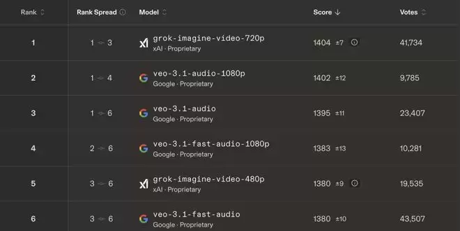 在Image-to-Video Arena(arena.ai)排行榜上,Grok-image-video-720p以1404分位居第一(基于46.5万投票,34个模型),领先Google Veo-3.1-audio-1080p(1402分)。