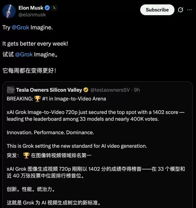 马斯克亲自发帖为自家Grok Image模型站台,称它每周都在迭代优化。