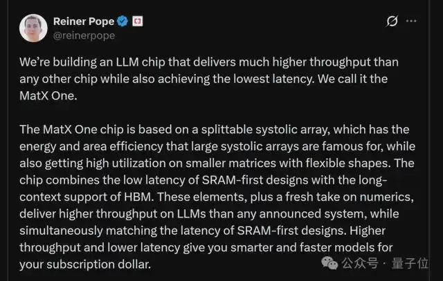 而且不止说说而已,据MatX创始人透露,他们目前正在打造一款“LLM专用芯片”MatX One: