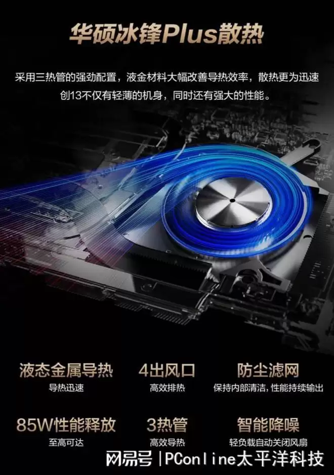 搭配华硕冰锋Plus散热架构,由三热管、液金材料、四出风口组成,大幅改善导热效率,带来至高85W强劲性能释放。并支持通过Fn+F快捷键,实现安静/标准/性能等模式切换,还可进入创作者中心,自定义性能更强的手动模式,完美匹配多种用机场景下的性能所需。