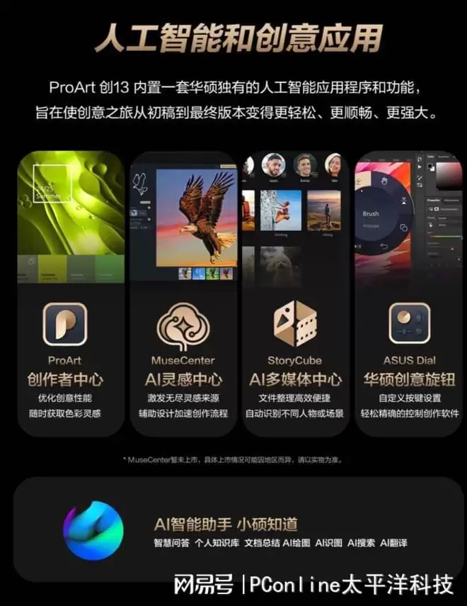 其中,MuseCenter AI灵感中心(具体上线情况以实物为准)借助AI技术轻松生成创意,带来灵感地图、灵感画布、灵感库等功能,改善内容创作者创建、管理图像以及存储创意想法的流程,让创意灵感触手可及;ProArt创作者中心提供控制面板、色彩管理、智能工作、性能优化、用户中心等功能,让创作装备更符合个人创作习惯;StoryCube AI多媒体中心,轻松从各种设备和云平台收集照片、视频和音频等,并根据用户喜好进行智能整理和分类,提供无缝、高效的文件整理体验;“小硕知道”AI智能助手,依托端云一体大模型带来智慧问答、文档总结、AI绘图/识图、电脑设置、软件控制等诸多实用功能,并支持断网可用,以更智能的AIGC创作体验全程辅助创意工作流;集成于机身C面的华硕创意旋钮,深度适配众多创作软件,指尖旋转即可实现超70个快捷功能,精准调整各项参数,提升创作的便捷性与专业性。