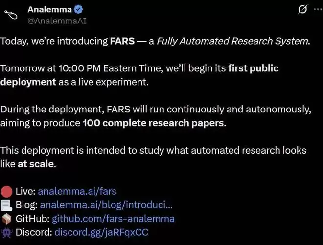 Analemma 在推文中声称,他们将面向全球公开直播部署端到端 AI 研究系统 FARS