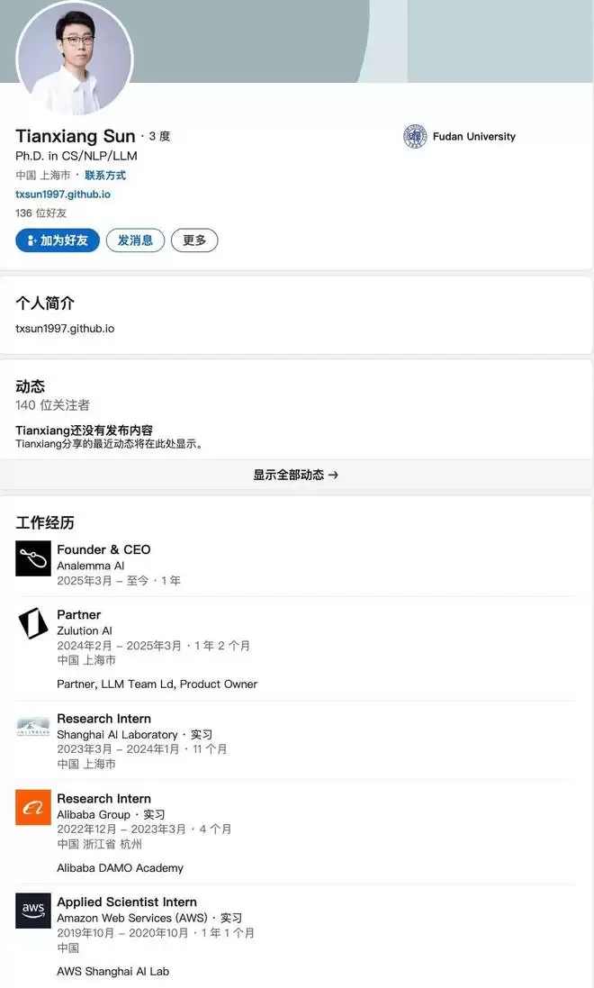 相信大家对孙天祥并不十分陌生。他于 ICML、ICLR、ACL、EMNLP、NAACL 等国际顶级会议发表论文 20 余篇,被引用 5000 余次,曾获世界人工智能大会云帆奖、字节跳动奖学金、复旦大学学术之星等荣誉,曾于 Musical.ly 创始人阳陆育创办的初创公司 Zulution AI 担任合伙人,现于上海创智学院担任助理教授。