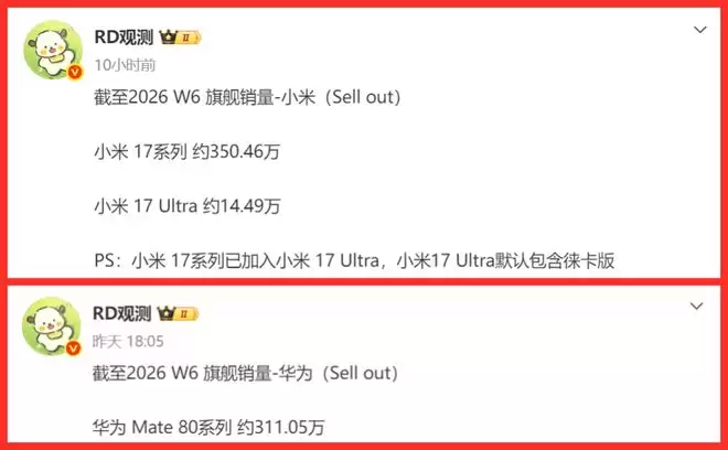近期有博主接连甩出两组数据:截至2026年第6周,华为Mate 80系列累计销量311.05万台,小米17系列累计销量突破350.46万台。
