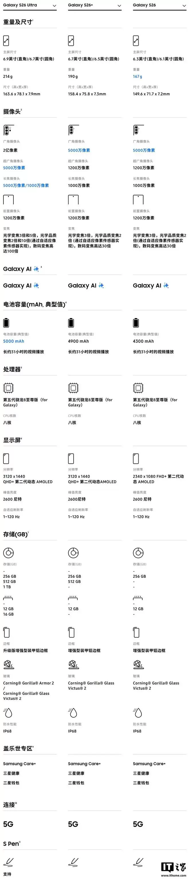 S26 和 S26+ 两款新机分别搭载 6.3 英寸和 6.7 英寸屏,均可选四款普通配色和两款正式专属配色,重量分别为 167g 和 190g,厚度分别为 7.2mm 和 7.3mm,支持 IP68 防尘防水。两款新机采用“增强型装甲铝边框”,而 Ultra 版为“升级版增强型装甲铝边框”。