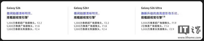 Galaxy S26 Ultra 广角摄像头升级至 F1.4 大光圈,成像亮度增强 47%;长焦摄像头配备 F2.9 大光圈,成像亮度提升 37%。