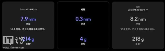 三星 Galaxy S26 Ultra 厚度 7.9 毫米、重量 214 克,机身改为了“升级版增强型装甲铝边框”,可选四款普通配色和两款正式专属配色;支持最高 16GB 内存和 1TB 存储空间,依然为 5000mAh 电池,不过充电速度更快,需搭配三星 60W 电源适配器使用,需单独购买。