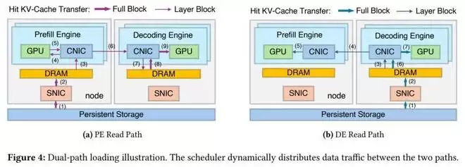 推理引擎(Inference Engines)。每个引擎管理一张 GPU。引擎分为两类:用于执行 prefill 的 Prefill Engine(PE),以及用于执行 decode 的 Decode Engine(DE)。流量管理器(Traffic Manager)。每个引擎内部都包含一个流量管理器,负责:(1)主机与设备之间的内存拷贝(H2D 与 D2H);(2)PE 与 DE 之间的 KV-Cache 传输;(3)通过存储网卡进行 KV-Cache 的读写操作。DeepSeek 采用以 CNIC 为中心的流量管理方案,以防止 KV-Cache 相关流量干扰模型推理过程中的通信。请求调度器(Request Scheduler)。一个中心化调度器,负责接收客户端请求并将其分配到不同引擎。同时,它还负责在两条加载路径之间动态分配数据流量(如图 4 所示)。