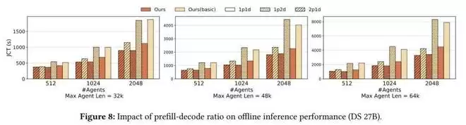 不同 Agent 批量规模与最大 Agent 长度(MAL)的影响。 随着批量规模增大以及 MAL 变长,DualPath 的优势更加明显。图 7 展示了在不同 batch size 与 MAL 组合下的 JCT 表现。SGL (MC) 出现错误,未能完成部分大规模配置(图中 token 为 N/A)。在 DS 660B 模型上,DualPath 相比 Basic 最高实现了 1.87× 的加速,并展现出接近 Oracle 的性能,这表明 KV-cache 的 I/O 开销基本被消除。在 DS 27B 上,DualPath 相比 Basic 最高提升 1.78×,但由于 1P1D 架构下存储带宽受限,其性能仍比 Oracle 慢 1.09–1.85×(见图 8)。对于 Qwen 32B,趋势与 DS 27B 类似。