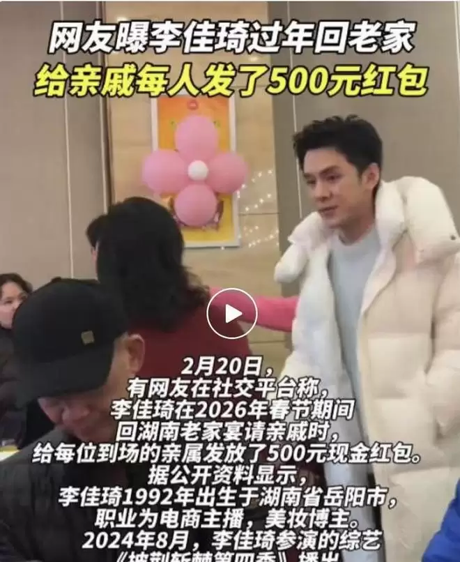 2026年春节刚过,2月25日,一条微博话题曝李佳琦过年给亲戚每人发了500红包猛地冲上热搜。 有网友在社交平台爆料,说李佳琦今年回了湖南岳阳老家,在家族祠堂前大摆宴席,场面热闹得跟办酒席一样。 最关键的是,他给每位到场的亲戚都发了一个现金红包,里面不多不少,正好是500元。