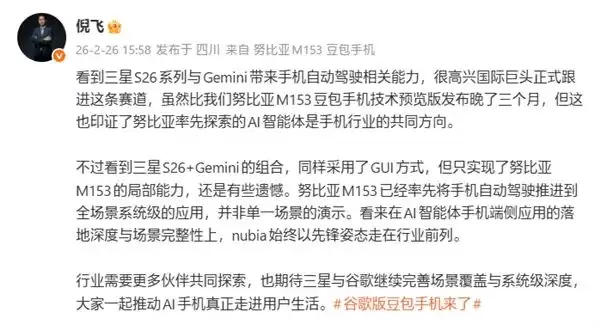 中兴通讯终端事业部总裁、努比亚技术有限公司总裁倪飞也针对该功能发文点评。他表示:三星 S26 系列与 Gemini 的组合仅实现了努比亚 M153 豆包手机的局部能力,虽乐见国际巨头跟进 AI 智能体赛道,但也对其功能落地的完整性表示遗憾。