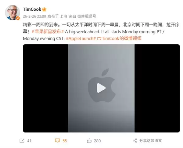 2 月 26 日晚间,苹果公司 CEO 库克在社交媒体上发文称:「下周会很热闹」,这标志着苹果春季新品发布会即将揭开序幕。