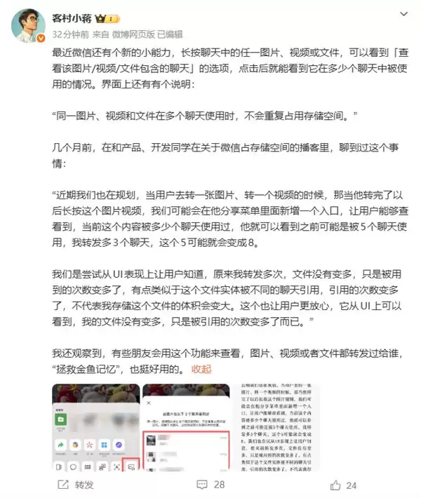 据微信员工「客村小蒋」在微博介绍:该功能的推出是为了让用户直观看到文件的使用情况,明确转发图片、视频或文件不会重复占用手机存储空间,从视觉层面缓解大家的存储焦虑。