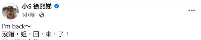 时隔一年的时间,小S正式宣布复工,她在个人账号高调发文:姐,回来了!