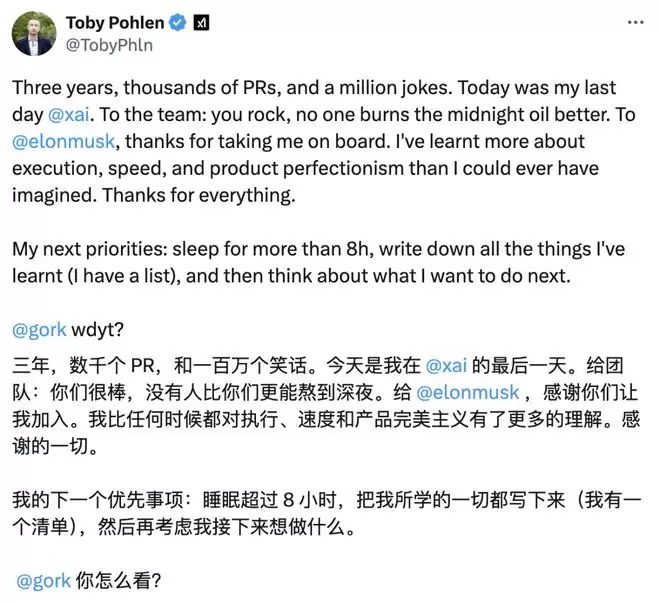 几乎同一时间,Grok团队的另一位核心研究员Toby Pohlen也宣布离职。